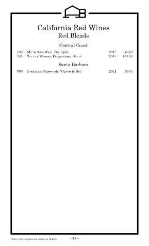California Red Wines Red Blends Central Coast 428 Murietta’s Well, The Spur 2019 48.00 765 Treana Winery, Proprietary Blend 2018 101.00 Santa Barbara 766 Beckmen Vineyards “Cuvee le Bec” 2021 50.00 Please note vintages are subject to change - 38 -